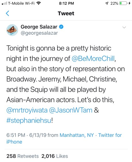 First off, on “The Broadway” attention must be paid to – no, NOT the TONY Winners, they have enough attention…the little show who was parodied but never mentioned, BE MORE CHILL by Joe Iconis.