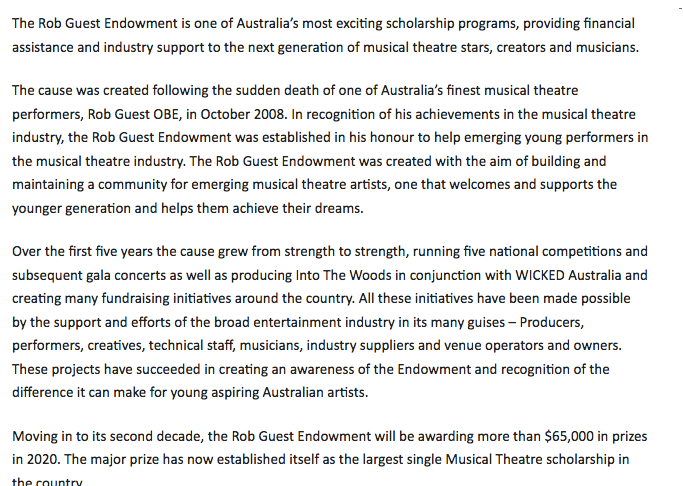 Which is why the Rob Guest Endowment is such a huge deal – it awards the winners $65,000 AUS to pursue their dream of making it to Australian stages and beyond, as one person stated to TFP, it is the first step to Aussie Musical Theater superstardom.
