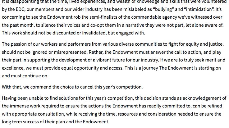 However as the semi-finalists’ names were now being bandied about in the Aussie press, they had to release their OWN statement about the excuses that the Endowment used to throw a hissy fit and storm off. Here is a quote