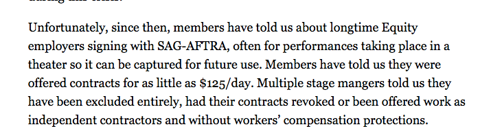 So on first glance, it seems like SAG/AFTRA is being somewhat reasonable until you understand they want to it look bad, and they want, in turn, to be able to pull the plug on this the minute they feel like it. They also want to have an Executive Oversight committee to meet regularly and discuss all the ways in which to pull blood from theater’s stone.