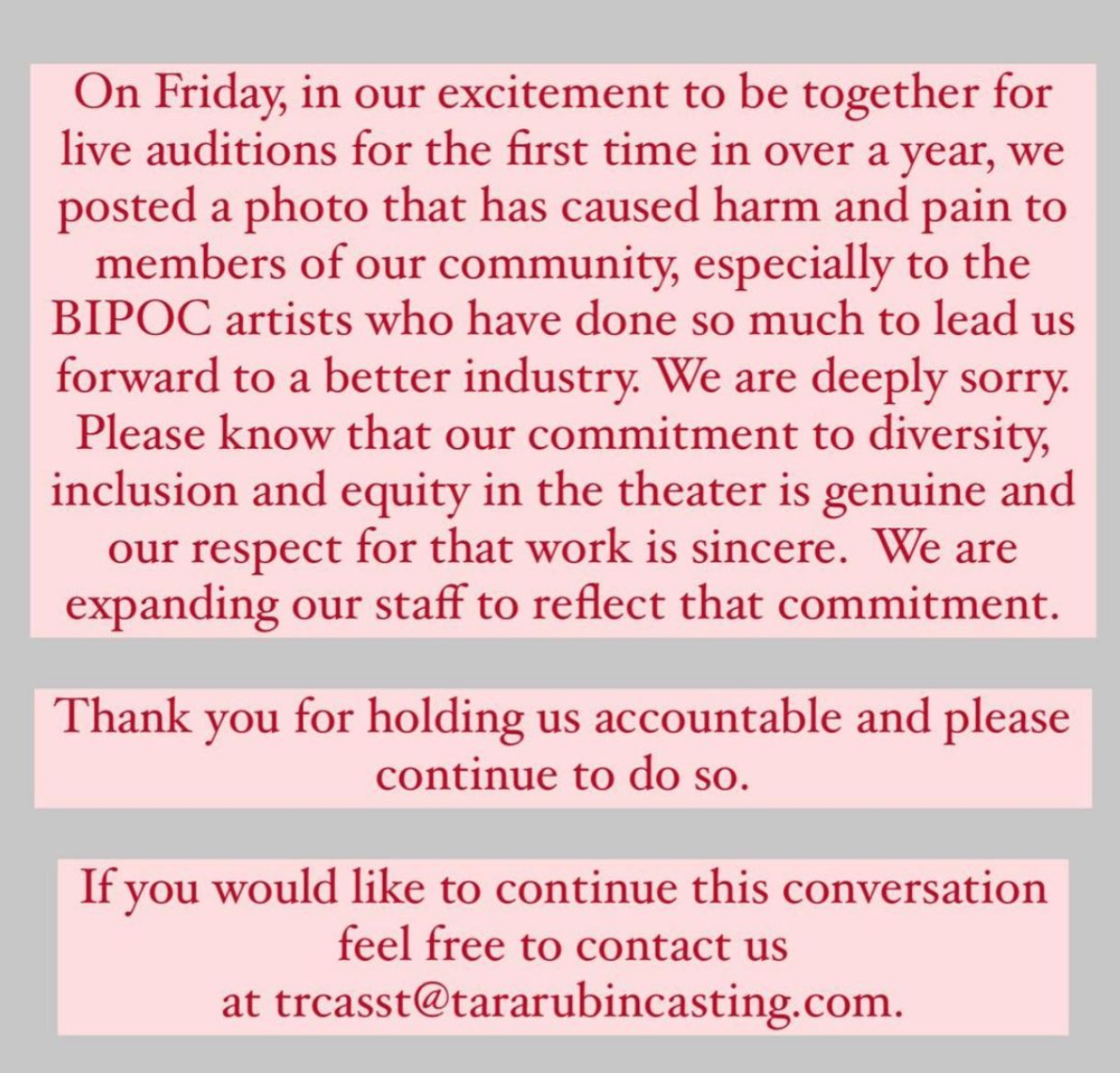 Be as brave as those at Tara Rubin Casting when they sent out to the world, a photographic representation of their staff, right after showing a very supportive image of Mr. George Floyd.