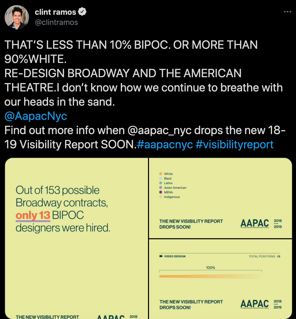 The Fairy Princess had hoped that – magically – that pandemic would have really changed people. That all the diversity statements that occurred when people were murdered or attacked would affect genuine change – but that is not the case in theater, and frankly, though TFP was ‘hopeful’, she knew that POC who are not in charge of much, were going to return to our ‘designated‘ spots once theater opened back up again – and she has been proven absolutely whi….er…right.