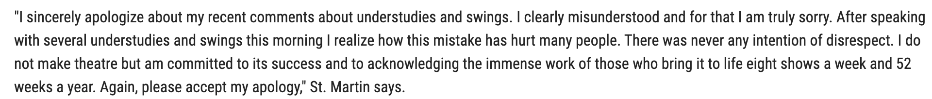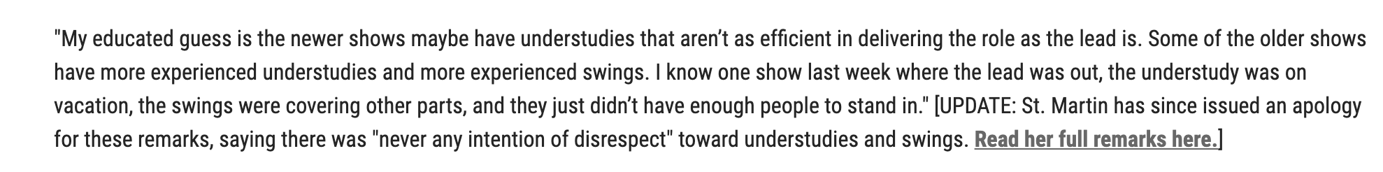 They have a lot of power. Broadway does not exist without them. TFP is venturing to guess that Ms. St. Martin had to deal with some very irate members of the League, who know the value of their understudies. The fact that the retraction happened as quickly as it did, is proof something went down behind doors.