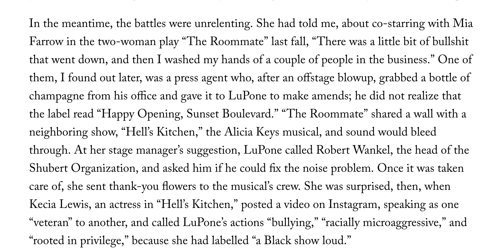 Ms. Lewis and her ten Broadway shows and her TONY award in 2024 is a testament to her staying in the industry as it changed, and being the change she wanted to see. The two journeys are not comparable. That is all TFP wanted to say.