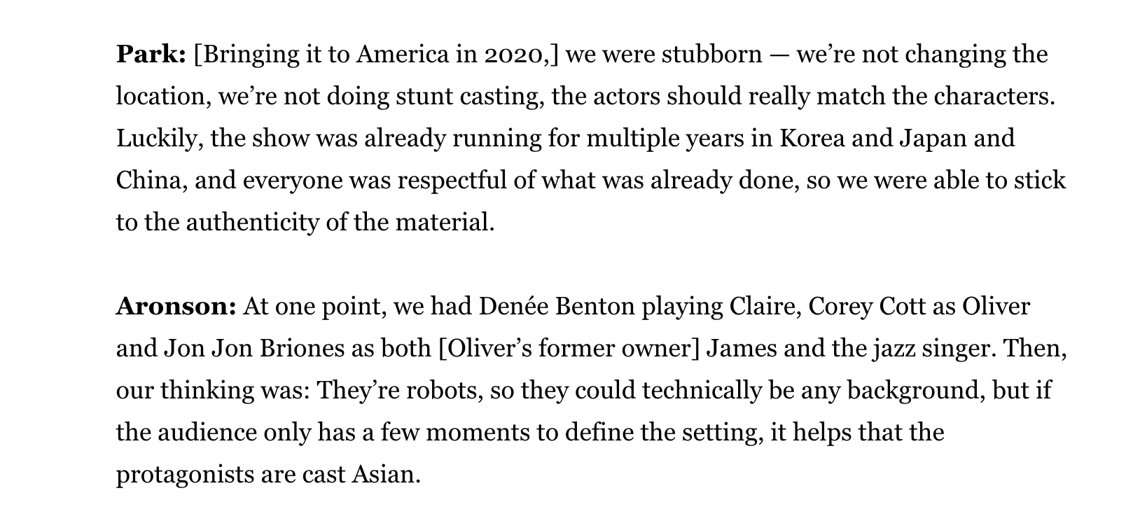 This is a Producer decision, and clearly the producer is digging their heels in. They have used their considerable influence and ability to sign checks and sent forth all manner of people of color – to advocate for a non-AANHPI HelperBot to become accepted as part of the shows’s Zeitgeist.
