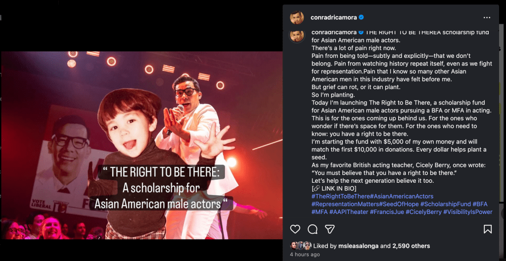 There are workshops giving TFP hope right now, BD Wong’s letter is giving hope right now, Michael K. Lee’s social media posts all the way from South Korea, Drama Desk Winner and Korean adoptee Deborah S. Craig’s open letter, Award winning Alec Mapa’s social media posts, Telly Leung’s open letter, Conrad Ricamora’s scholarship for AANHPI males giving hope right now, Lauren Yee’s Community Night sponsored by Signature Theater, but there is a river of sadness running beneath all of that.