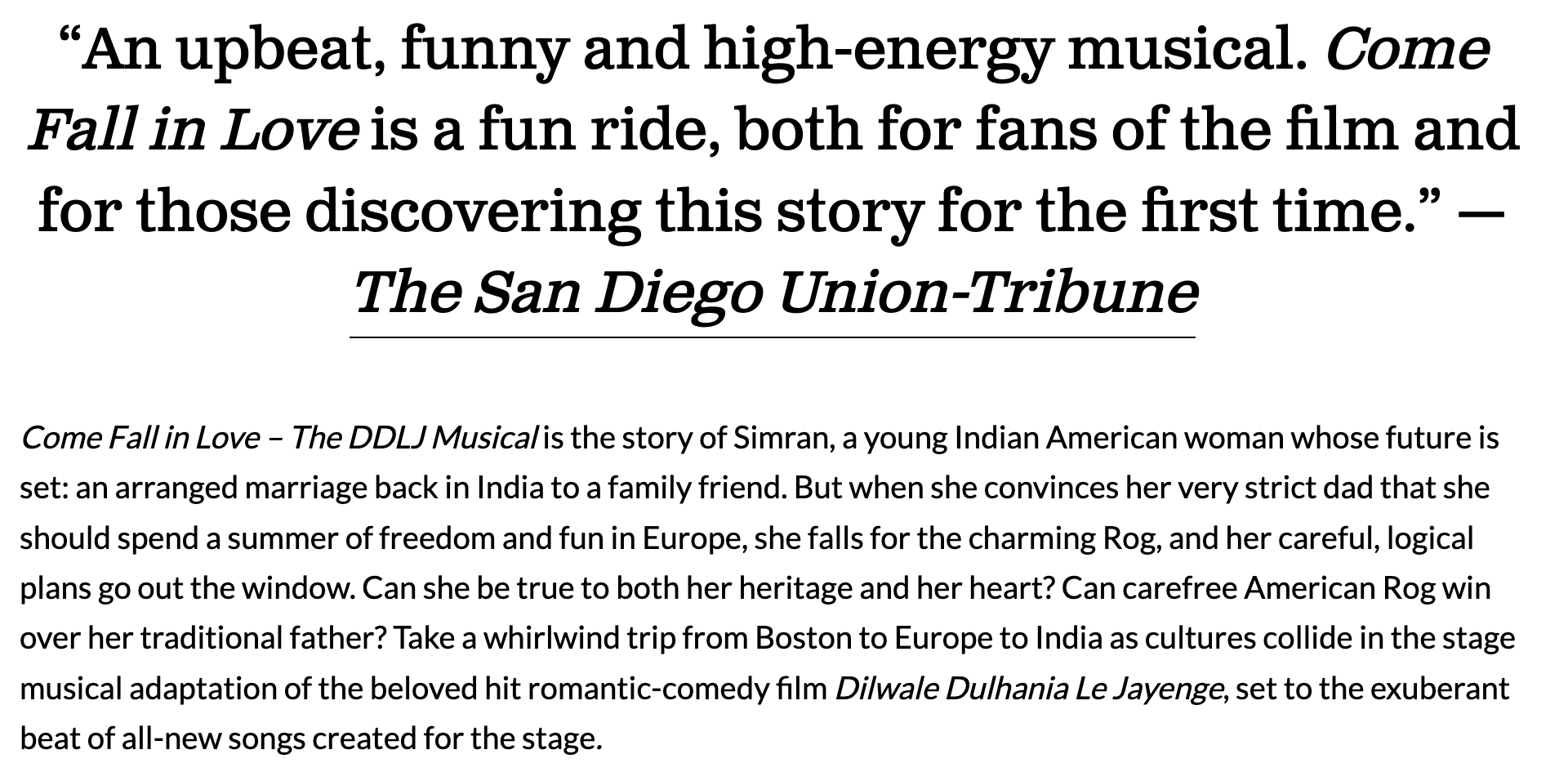 Next up for Ms. Benjamin is the stage musical, COME FALL IN LOVE, the DDLJ Musical which featured a heavily South Asian company, and is Broadway bound.